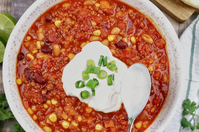 Dodajte meso i iseckan celer, kratko prodinstajte sve zajedno, posolite, pobiberite i zalijte bujonom. Zatim u varivo dodajte iseckan pelat i kuvajte 15 minuta. Na kraju dodajte kukuruz i pasulj pa prokuvajte sve još 5 minuta i dodatno začinite po želji.