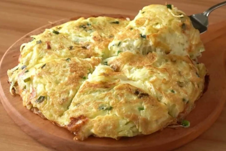 Krompir oljuštite i izrendajte, pa pomešajte sa jajima koja ste prethodno umutili, sekcanim mladim lukom, pa posolite i pobiberite. Sve dobro promešajte. U tiganj sipajte malo ulja, pa kada se zagreje dodajte pola smese sa krompirom i lepo rasporedite po celom tiganju.