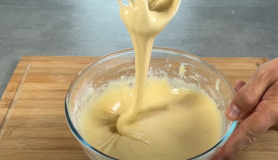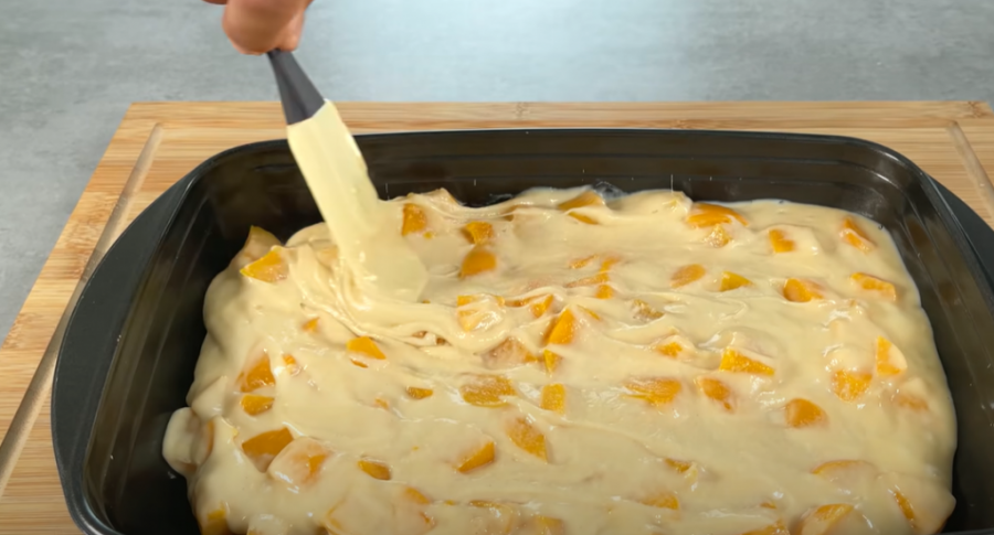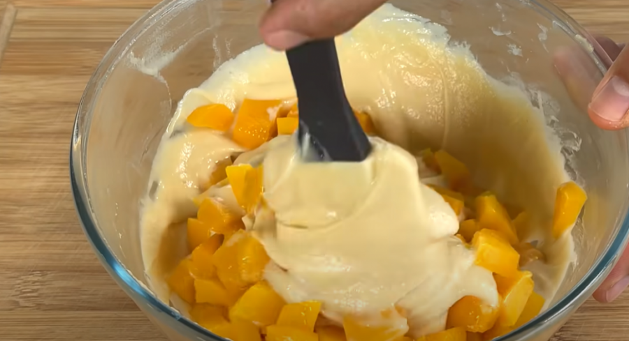 Prvi korak: U jaja dodajte šećer i mleko, a potom sve sjedinite ručnom mutilicom. Brašno prosejte direktno u činiju. Testo koje dobijete mora biti izuzetno gusto. U ovom receptu korišćene su breskve iz kompota, ali možete i koristiti sveže koje su manje zaslađene.