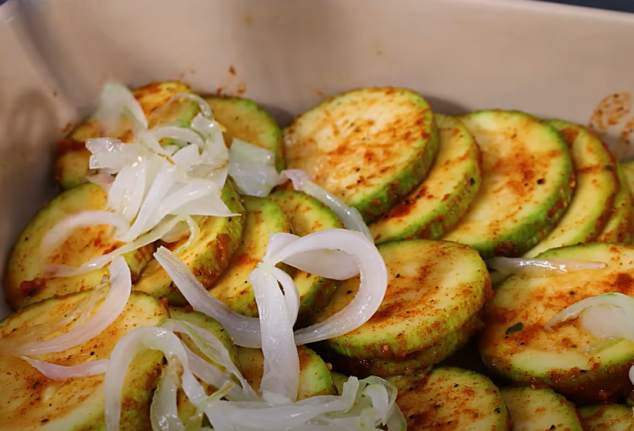 Zagrejte ulje, a onda dodajte sitno iseckan crni luk. Tikvicama isecite krajeve, a onda ih ogulite, a potom isecite na kolutove i prebacite ih u činiju. Tikvice posolite i dodajte jednu malu, punu kašiku suvog začina i biber po ukusu najbolje oko pola male kašike. Nakon toga i crvenu začinsku papriku punu kašiku. Spojte tikvice sa začinima i tako pripremljene ih poređajte u vatrostalnu činiju.