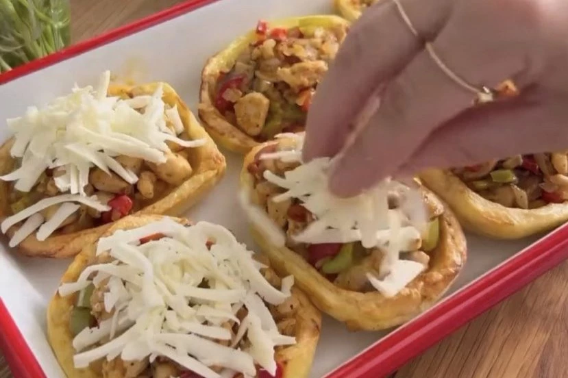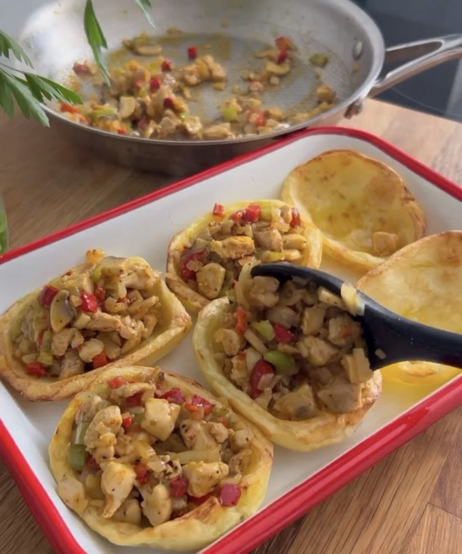 Krompir prepolovimo i izdubimo. Izdubljenje ostavite u vodi za kasnije, a od njega možete pripremiti nešto drugo. Krompir posolimo i pospemo maslinovim uljem i pržimo u fritezi ili rerni oko 15 minuta. Na malo ulja propržimo piletinu i pustimo da se ocedi, potom dodajemo luk i mesamo, a onda pečurke dinstamo. Tek pri kraju dodajte začine. U ispečene krompire dodajte piletinu, prelijte malo paradajz sosom i ostavite da se zapeče u rerni.