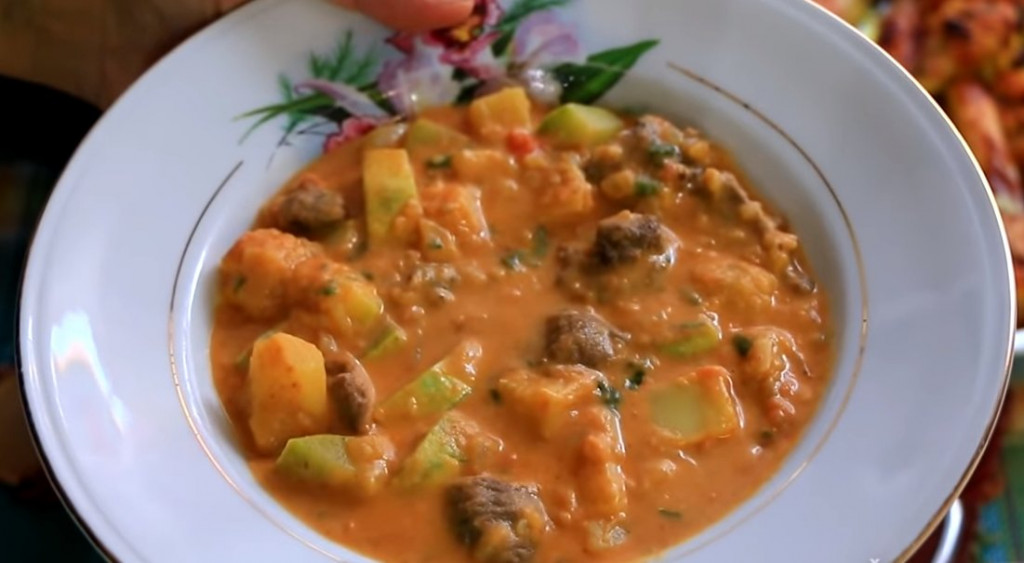 Kada meso omekša, dodamo krompir isečen na kockice, mleveni biber, mleveni kim i suvi biljni začin, pa kuvamo dok krompir ne omekša.