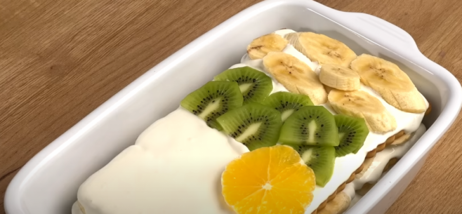 Keks umačite u mleko, a potom poređajte na dno posude. U činiji sjedinite kiselu pavlaku i šećer u prahu, a onda umutite mikserom. Jedan deo stavite preko keksa. Banane naseckajte na kolutove. Poređajte banane preko fila, a potom stavite keks i fil ponovo. Na vrh stavite keks još jednom. Potom stavite fil na vrh. Pomorandžu oljuštite i isecite na kolutove. Isto uradite sa kivijem ili nekim drugim voćem.