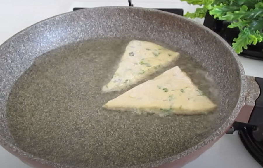 Testo podelite na dva dela i premesite ga. Loptu koju ste napravile rasklagijajte. Razvucite testo, ali ne da bude previše tanko i podelite na osam delova. Isecite na trouglove i isto uradite i sa drugom lopticom. Stavite tiganj da se zagreje na ringli i dodajte 200 mililitara ulja. Kada se ulje zagreje stavljajte jedan trouglić i pržite. Nakon što je dobio zlatnu boju okrenite i pržite na drugoj strani.