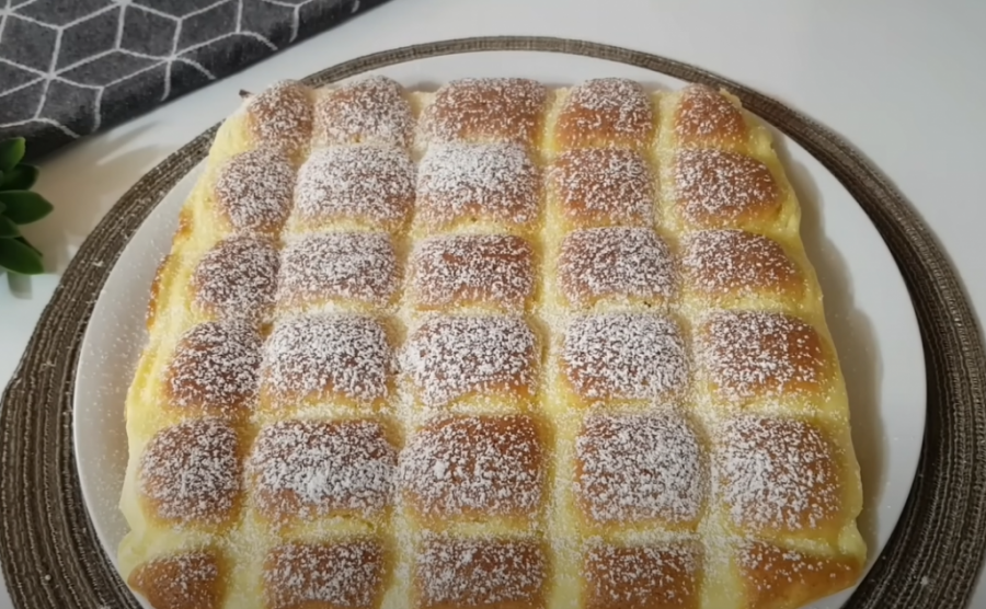 Napravite kockice od fila. Pecite na 180 stepeni oko 30 minuta dok gornja korica ne postane zlatne boje. Kolač pospite šećerom u prahu, isecite na kocke i služite.