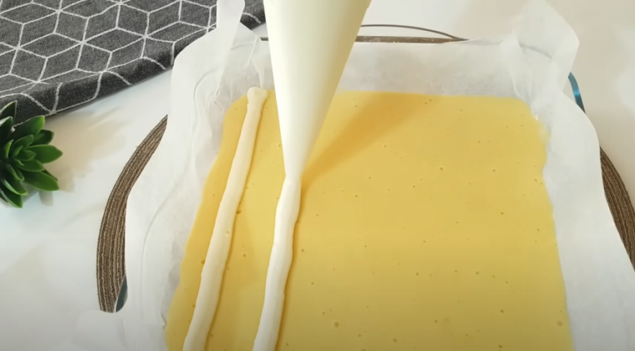U 250 grama krem-sira dodajte jedno jaje i dve velike kašike kristal-šećera, potom i jednu veliku kašiku šećera u prahu i kesicu vanilin-šećera. Sve umutite štapnim mikserom dok smesa ne postane ujednačena. Prebacite je u špric za dekorisanje kolača. Dobijenu smesu špricem stavljajte u vidu linija na kolač kao na fotografiji ispod.
