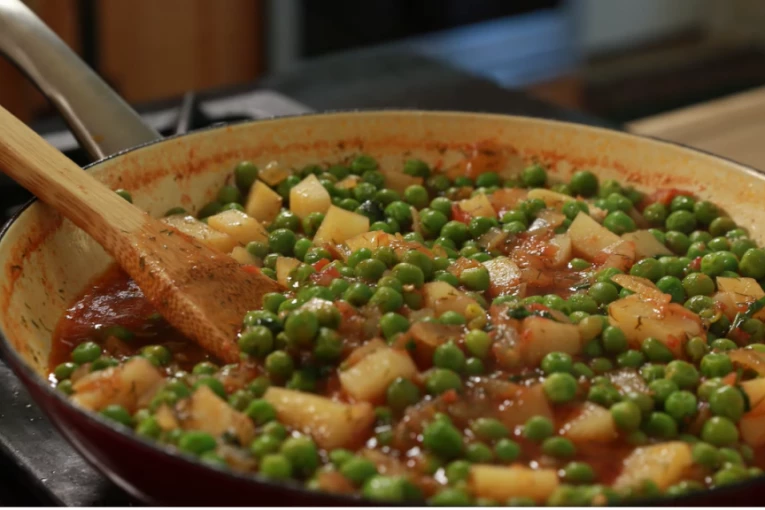 Iseckajte crni luk i propržite ga dok ne omekša, pa dodajte mleveni beli i ostavite još minuta. Zatim dodajte seckani krompir, paradajz sos, vodu, pa posolite i pobiberite. Pospite tucanom paprikom i promešajte. Kada proključa smanjite temepraturu i kuvajte još 15 minuta. Zatim dodajte graška i kuvajte još 5 minuta. Na kraju dodajte mirođiju i nanu i opet promešajte. Ovo jelo ima najbolji ukus kada se ostavi da odstoji najmanje 45 minuta.