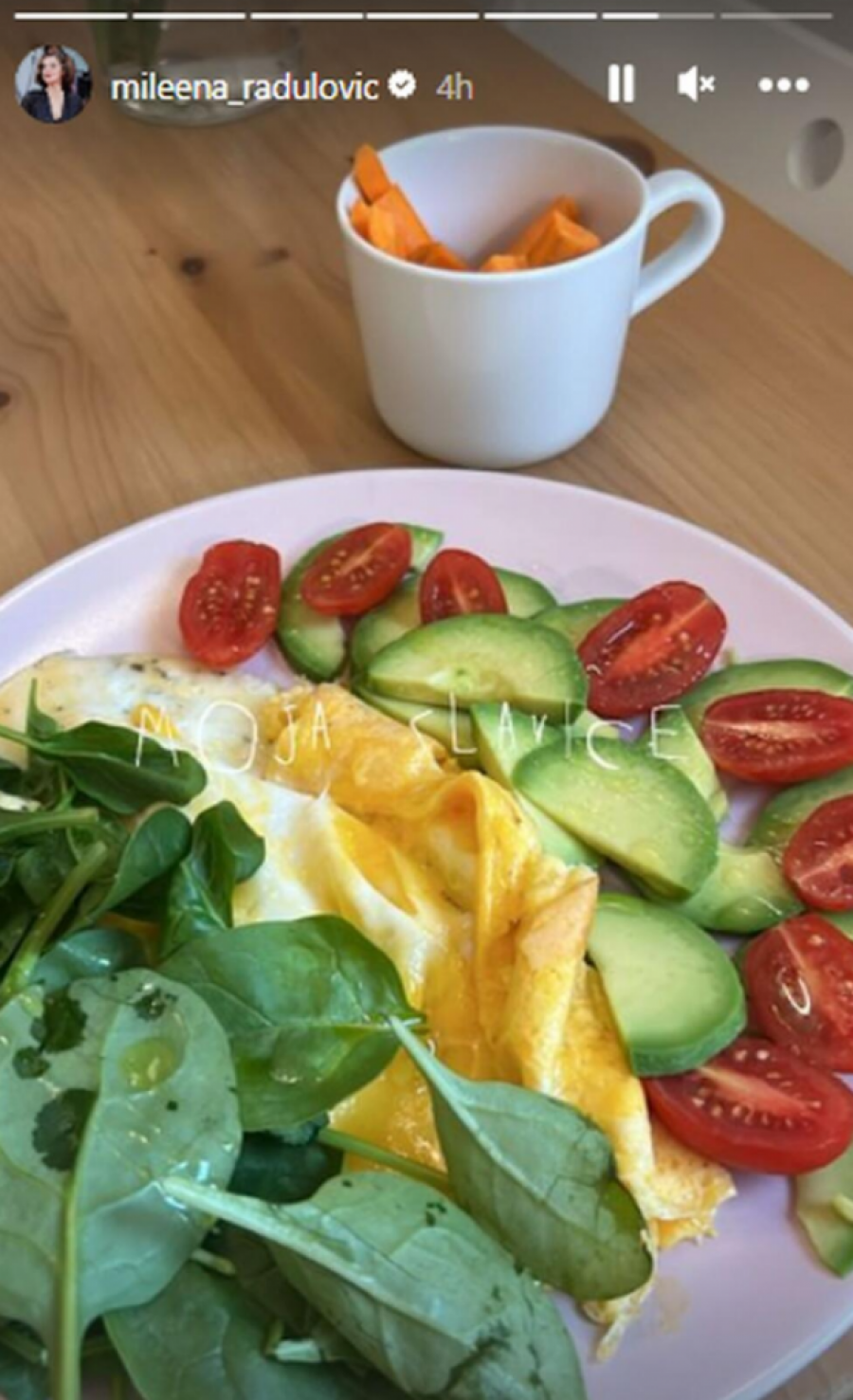 Na slici koju je objavila na Instagramu, možemo videti Milenin zdravi doručak koji se sastoji od kajgane, svežeg spanaća, čeri paradajza i avokada. Ovi sastojci su pravi izbor za pravilnu ishranu i održavanje vitke linije. Jaja su prava energetska bomba, bogata proteinima, omega - 3 masnim kiselinama i vitaminima D, E i B12. Spanać, koji se savršeno kombinuje sa jajima, sadrži kalcijum, gvožđe, magnezijum i vitamin A. Avokado, kao izvor nezasićenih masti i biljnih vlakana, je pravi izbor za zdravu ishranu. Paradajz takođe ima mnogo vitamina i minerala.