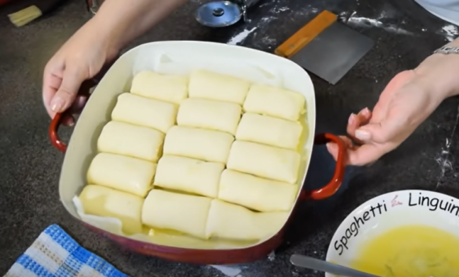 U pleh 23x23 cm stavite papir za pečenje. Rolat secite na 4 cm dužine. Uzmite 150 grama putera i otopite. Svaku rolanicu sa donje strane umočite u puter i ređate u pleh. Višak putera stavite preko. Umutite jedno žumance i takođe pređite preko rolnica. Pustite oko 5 minuta da narastu i onda mogu na pečenje.