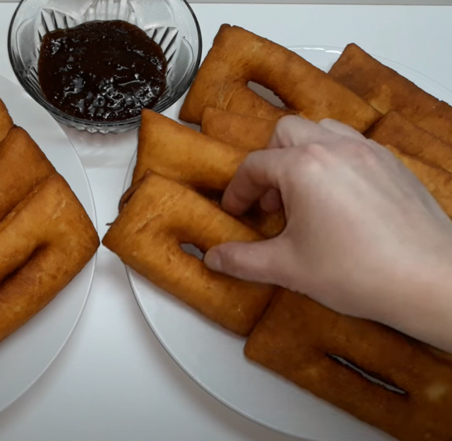 Potom prebacite na radnu površinu, pospite brašnom i rasklagijajte. Secite na pravougaonike dugačke oko 5 - 6 cm. Po sredini testa napravite mali rez. Ubacite u vrelo ulje i pržite.