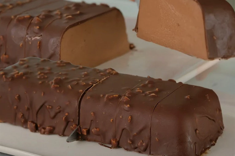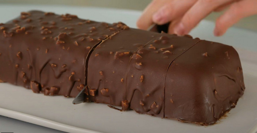 U vantrostalnu posudu izlijte smesu koju ste prethodno kuvali. Stavite u frižider na dva sata da se stegne, ako procenite može i malo više. Tamnu čokoladu otopite, možete na pari ili u mikrotalasnoj, onako kako je vama lakše. Možete iskoristiti i neku čokoladu sa komadićima lešnika kako bi bilo ukusnije.