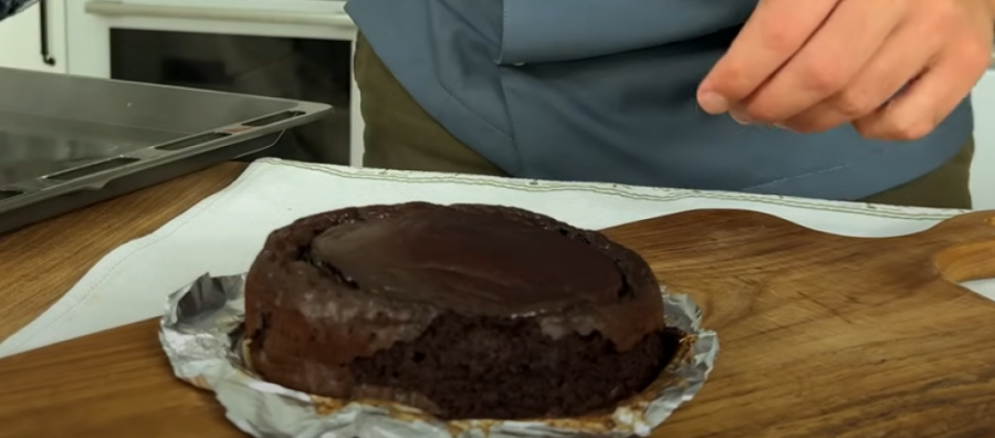 Kolač kada je gotov izvadite. Polako skinite papir za pečenje sa svih strana. Prelijte ga otopljenom, tamnom čokoladom.