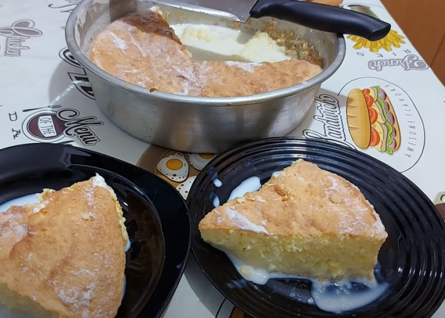 U posebnoj šerpi skuvajte litar mleka, tri kašike šećera i vanilin šećer. Zagrejete tako da bude vrelo, a onda time prelijete vruć patišpanj. Izbockajte biskvit da bolje upije. Možete jesti vrelo, ili sačekajte da se potpuno ohladi.