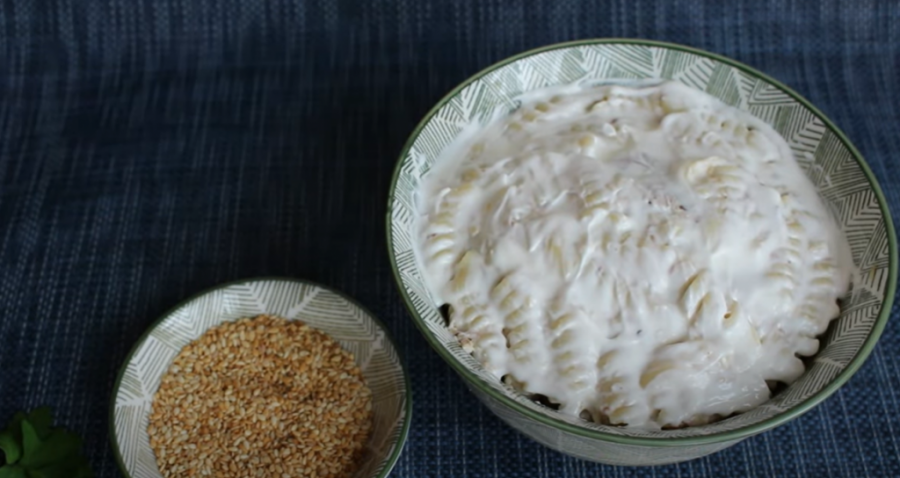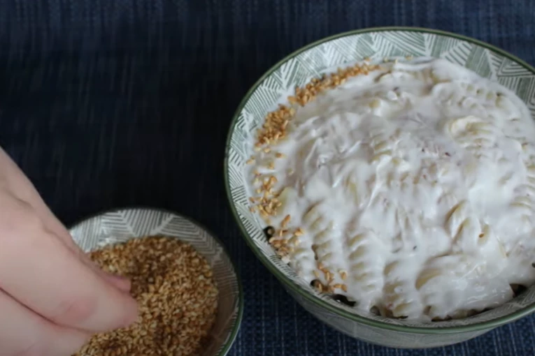 Na tihoj vatri kratko propržiti susam. Sve vreme mešajte dok ne porumeni. Stavite vodu da se greje, a kada krene da vri dodajte makarone i kuvajte. Makarone ocedite od viška tečnosti kada su se skuvale i ubacite kada se ohlade tunjevinu. Dodajte pola kašičice soli i 50 grama susama. Po želji dodajte i začine koje volite i sve zajedno sjedinite kašikom.