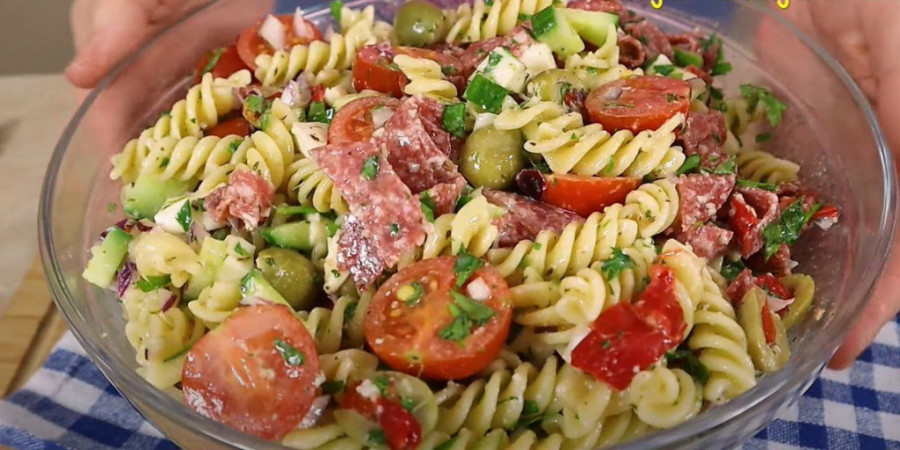 U testeninu stavite peršun, lučenu papriku, masline, mocarelu, paradajz, čajnu, krastavac i luk. U činiji sjedinite maslinovo ulje, majonez i jabukovo sirće. U tu smesu dodajte gore navedene začine. Preliv dodajte u salatu i sve dobro promešajte.