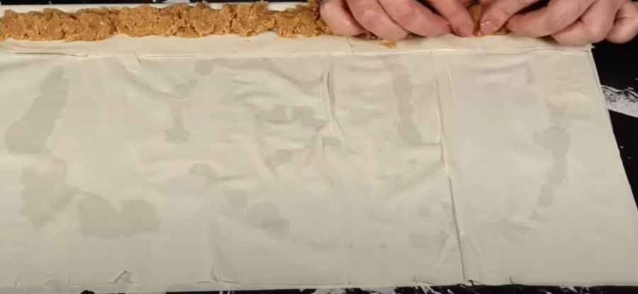 Na prvu koru stavite par kapljica ulja, potom drugu koru, a onda stavite nekoliko kašika fila i rolajte tanku rolnicu. Pred kraj rolanja stavite malo ulja na kraj kore i "zalepite" rolnicu kada dođete do kraja. Pravite rolnice dok ne potrošite fil. Ređajte u pleh jednu do druge. Isecite ih na željene komade.