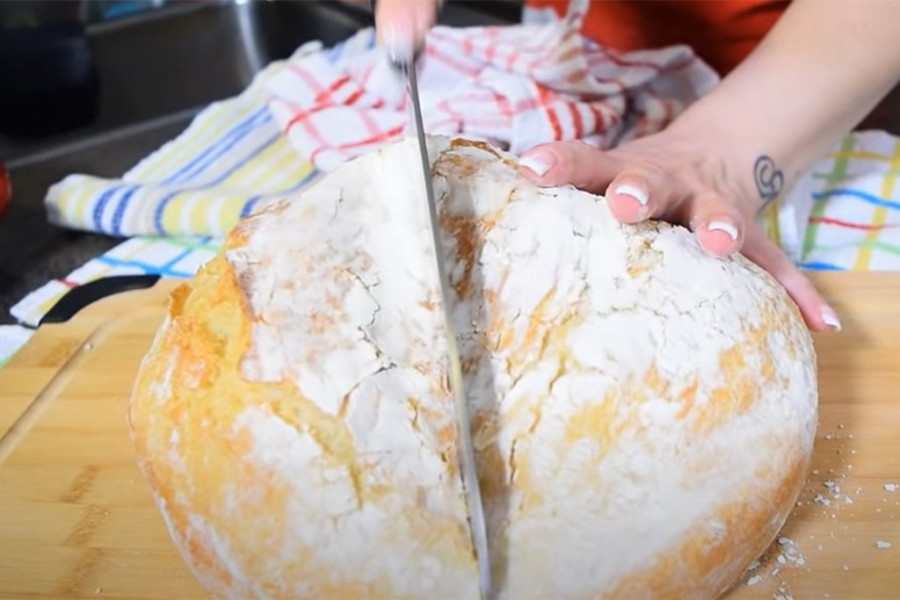 Nakon što je prošlo 20 minuta dodajte jednu kašiku ulja u testo. Ponovo sjedinite sve, pa ostavite opet 20 minuta. Malo razvucite testo ka gore oko dva do tri puta i ponovo ostavite oko pola sata. Ostatak brašna pospite po radnoj površinu. Prespite testo tu. Testo razvlačite tako što ćete ga preklapati. Testo treba da bude vazdušasto. Preklapajte ga na taj način dok ne potrošite ostatak brašna. Za ovaj hleb vam treba vrela šerpa sa poklopcem. Dno vrele šerpe pospite malo kukurznim brašnom. Tu prebacite testo. Pokrijte poklopcem i pecite na 200 stepeni oko 45 minuta.