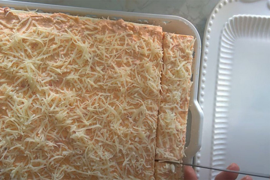 Zatim ide još jedan red kora i fila od ajvara, a onda belog fila i šunke. Opteretite tortu nečim teškim i ostavite pola sata. Nakon pola sata premažite tortu filom od ajvara. Tortu pospite rendanim kačkavaljem.