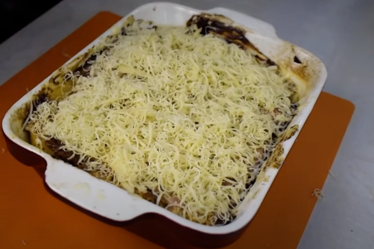 U posebnoj činiji mleveno meso sjedinite sa začinima. U meso dodajte kiselu pavlaku, a onda lepo sjedinite kašikom. Preko krompira stavite mleveno meso. Zagladite kašikom i jelo pokrijte aluminijumskom folijom. Stavite jelo u zagrejanu rernu i pecite pod folijom oko 20 minuta na 200 stepeni, a onda je skinite i pecite još 20 minuta. Nakon pečenja dodajte rendani kačkavalj. Stavite preko meso i vratite još pet minuta u rernu.