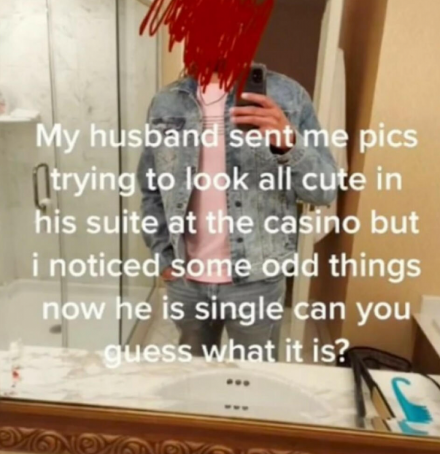 Na prvi pogled na fotografiji se ništa čudno ne "dešava", jednostavno se muškarac slika u farmerkama i majici. Ali zagledajte se bolje. On ne nosi burmu, a pored lavaboa stoje i pegla za kosu i češalj što sigurno nije deo hotelske opreme. To ukazuje da je prevario suprugu, ili postoji neko drugo i verovatno ne tako realno objašnjenje koje bi moglo da potkrepi njegovu priču. Bilo kako bilo ova žena očigledno nije pala na opravdanja čak i da su se desila, prenosi "Espreso".