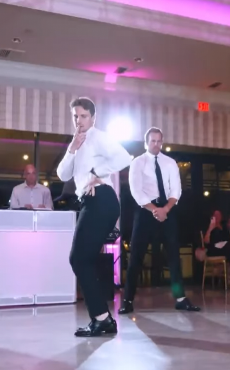 Njen suprug je stao u centar, a uz pomoć još dva plesača odigrao je svoju tačku. Pokazao je svoje umeće zadnjicom, a onda je legao na pod i nastavio da igra svoj deo tačke. Mlada se sve vreme oduševljeno smejala, te se ovakav nastup mnogima dopao.