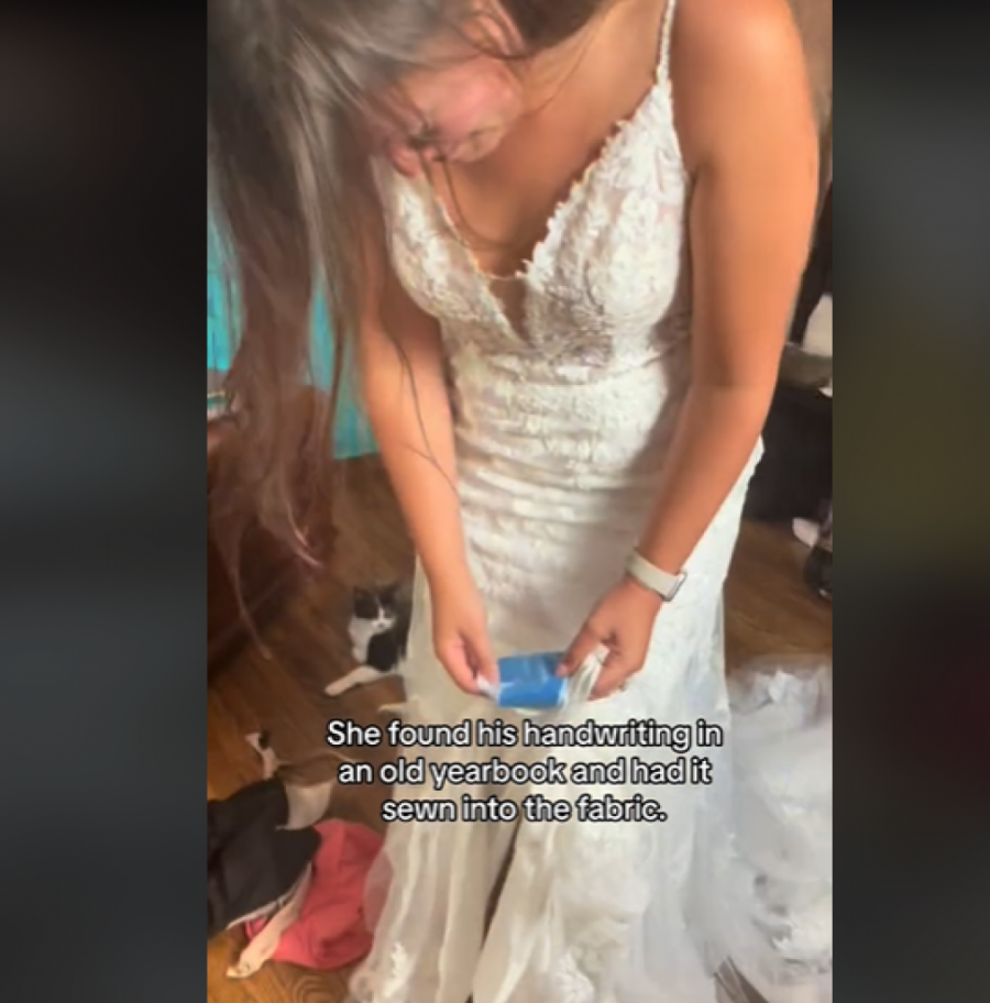 Natali je otkrila da je poruka na srcu inspirisana rečima iz njenog godišnjaka, a trag rukopisa njenog oca, koji je umro pre devet godina, pronašla je njena majka Devona Kroket. Majka je sama osmislila ovaj emotivni gest i prenela rukopis na majicu, koju je zatim krojačica pretvorila u srce koje je postalo deo venčanice.
