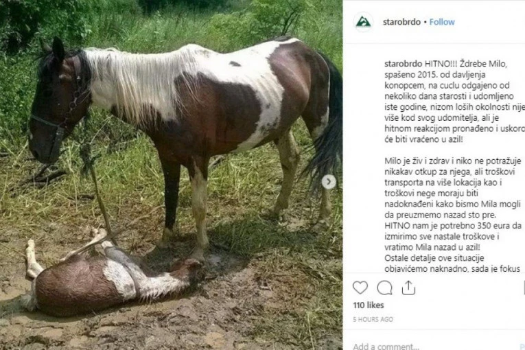 Foto: instagram.com/starobrdo- HITNO!!! Ždrebe Milo, spašeno 2015. od davljenja konopcem, na cuclu odgajeno od nekoliko dana starosti i udomljeno iste godine, nizom loših okolnosti nije više kod svog udomitelja, ali je hitnom reakcijom pronađeno i uskoro će biti vraćeno u azil! Milo je živ i zdrav i niko ne potražuje nikakav otkup za njega, ali troškovi transporta na više lokacija kao i troškovi nege moraju biti nadoknađeni kako bismo Mila mogli da preuzmemo nazad što pre. HITNO nam je potrebno 350 eura da izmirimo sve nastale troškove i vratimo Mila nazad u azil - apeluju iz ovog azila.