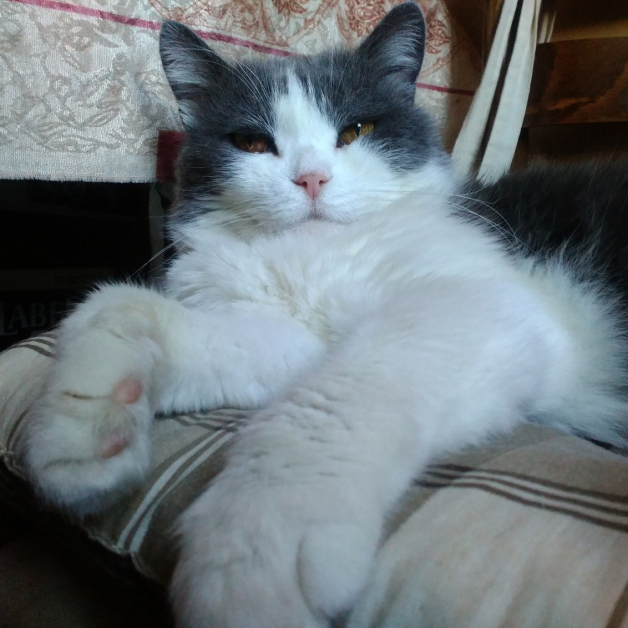 Debeli, mešanac domaće i ruske plave, star 11 godina, voli da se mazi i jede, a najviše uživa u spavanju