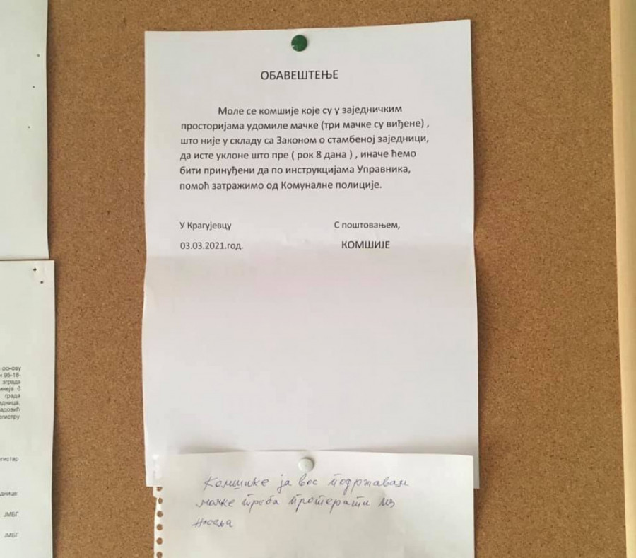 Inače, ove dve životinjece su privukle pažnju na društvenim mrežama pošto se pojavilo obaveštenje na kome komšija traži da se izbace mačke iz zajedničkih prostorija zgrade inače će zvati komunalnu policiju. Vrhunac nehumanosti je rukom dopisan komentar podrške da se mačke proteraju iz kraja.