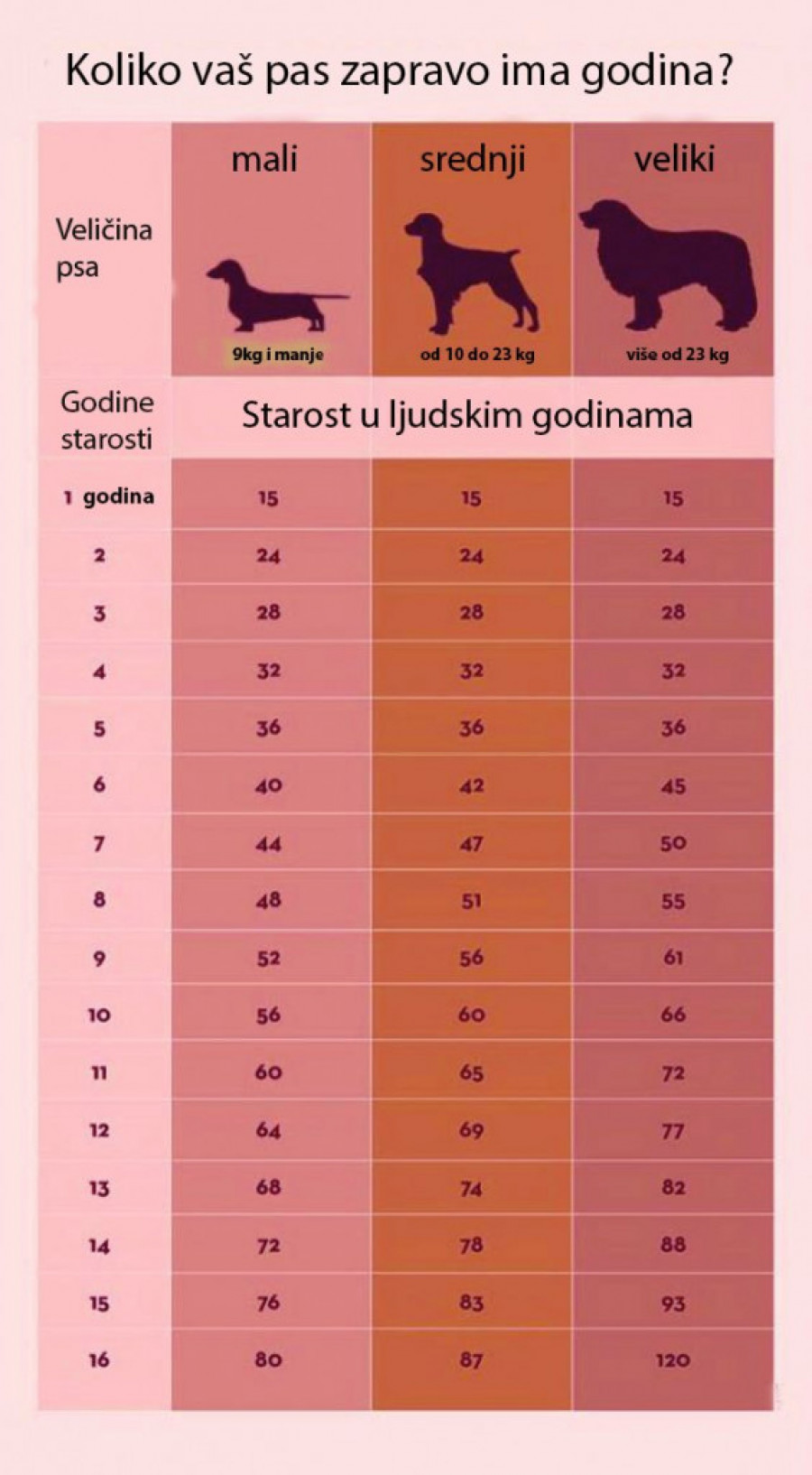 Prema Veterinarskom udruženju Amerike, pravilo je otprilike ovako - prva kalendarska godina psa ekvivalent je 15 ljudskih, druga kalendarska donosi još devet ljudskih, a svaka sledeća je po pet. Tako je sve do šeste godine psa, a onda se godine računaju na osnovu veličine.