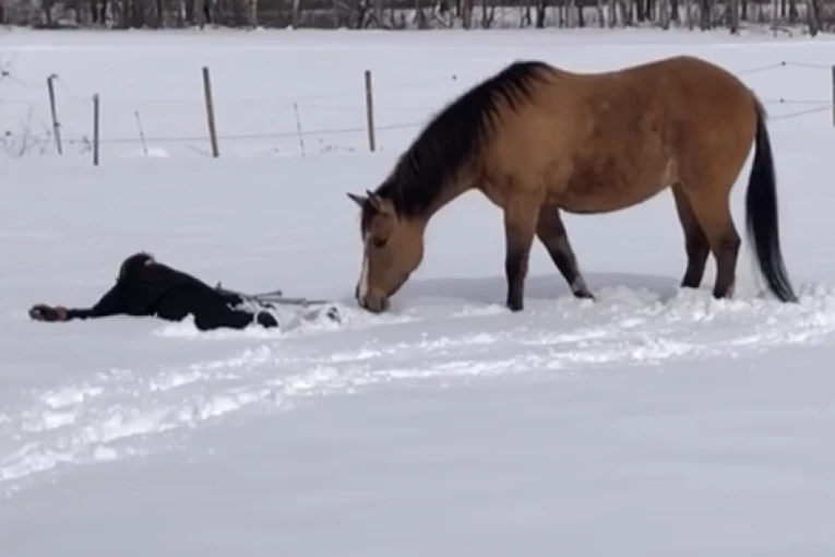 U pitanju je trenutak kada žena uživa u snegu. Tokom zimskih čarolija odlučila je da legne i da napravi anđela u snegu, a potom joj prilazi konj. Ono što se desilo nakon što je žena legla u sneg, ostaviće vas bez daha.