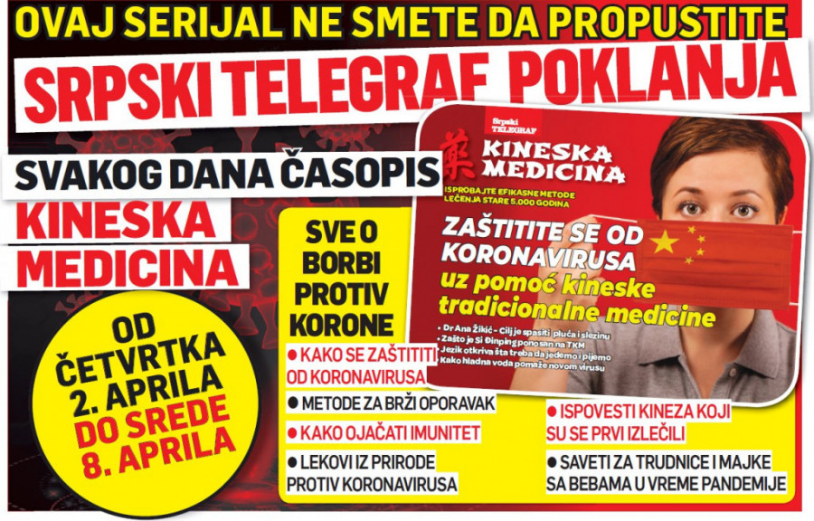 Sve ove priče i još puno korisnih informacija za efikasnu borbu protiv koronavirusa možete pročitati u časopisu "Kineska medicina", koji poklanjamo uz štampano izdanje Srpskog telegrafa svakoga dana, počev od srede 2. aprila.