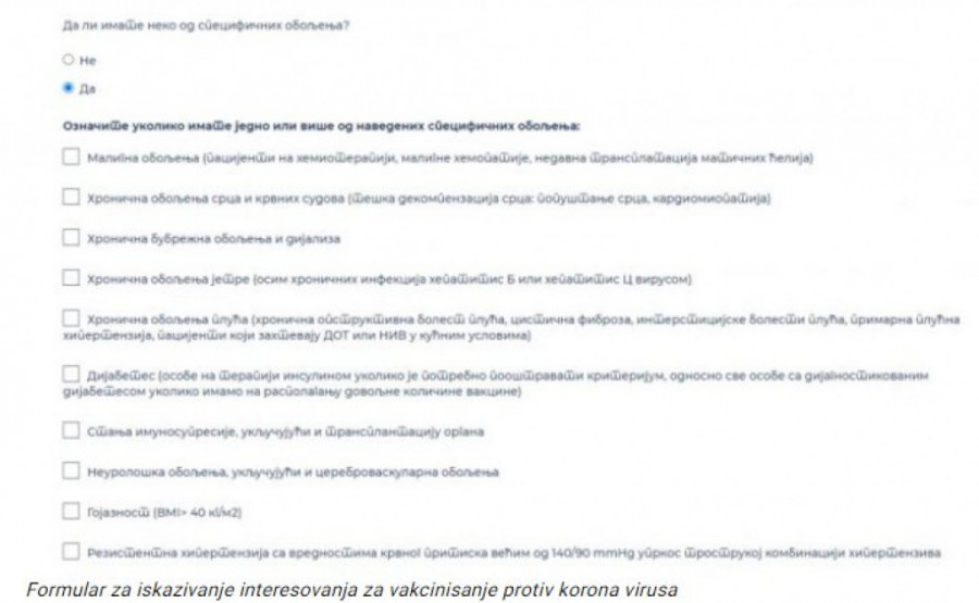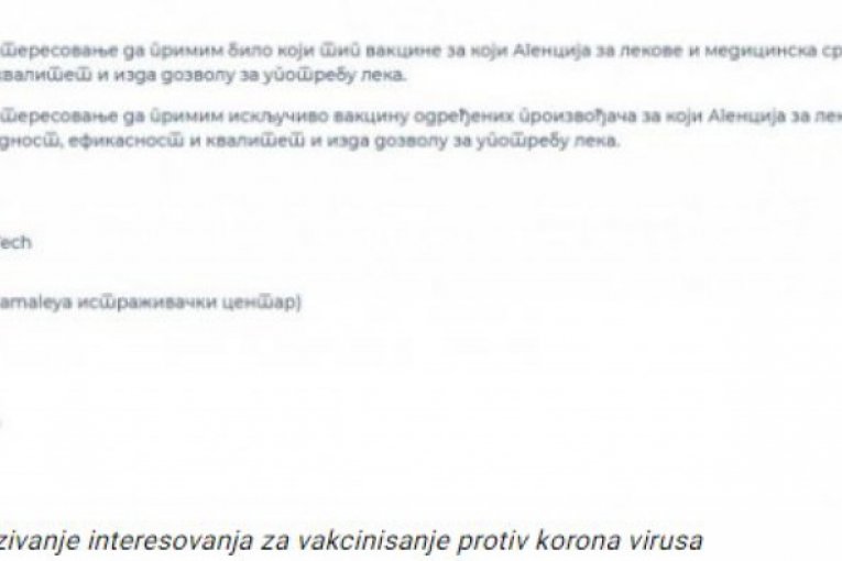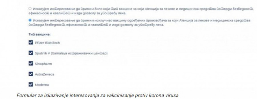 Kada popune osnovne podatke, građani se izjašnjavaju o tome da li iskazuju interesovanje za bilo koji tip vakcine koji je u upotrebi u Srbiji ili žele da se vakcinišu određenom vakcinom.