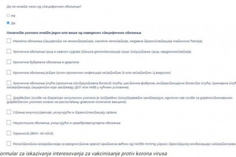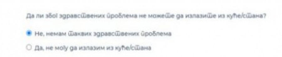 Poslednje pitanje u formularu odnosi se na to da li osoba koja je zainteresovana za vakcinaciju ima takve zdravstvene probleme da ne može da napusti mesto stanovanja.
