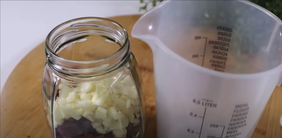 Uzmite jednu kesu za zamrzivač i u to stavite ljusku od luka. Rukom izgnječite kesu. Uzmite jednu teglu i tu prebacite ljusku. Potreban vam je beli luk, šest čena. Nožem oljuštite beli luk, a onda ga iseckajte na sitne komadiće. Beli luk stavite u teglu preko ljubičastog. U poseban bokal sipajte 200 mililitara ulja ili neko biljno ulje. Prespite ulje u teglu preko luka. Masilnovo ulje omekšava kožu i čini je glatkom. Stavite krpu u šerpu i u sredinu ubacite teglu. Sipajte vodu u tu istu šerpu sve dok se krpa skroz ne potopi. Prebacite na ringlu na srednju temperaturu. Kada krene da ključa, smanjite temperaturu. Kuvajte 20 minuta na laganoj vatri. Ugasite šporet i ostavite da stoji još 10 minuta. Nakon toga izvadite teglu i ostavite da se ohladi.