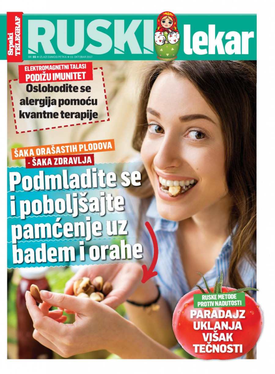 Foto: Srpski telegrafU izdanju koje izlazi u petak 13. 10. 2017. saznajte kako da se podmladite i poboljšate pamćenje uz orašaste plodove, kako da se oslobodite alergija pomoću kvantne terapije, upoznajte se sa ruskim metodama protiv nadutosti. Između ostalog, biće i zdravih recepata sa prokeljom.