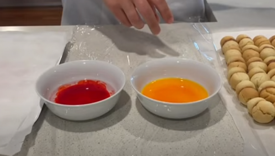 Napunite kuglice smesom spojite ih. Tako spojene umočite u jestivu boju, žutu pa crvenu. Stavite ih na ubrus da se ocede, a zatim ih uvaljajte u kristal šećer.