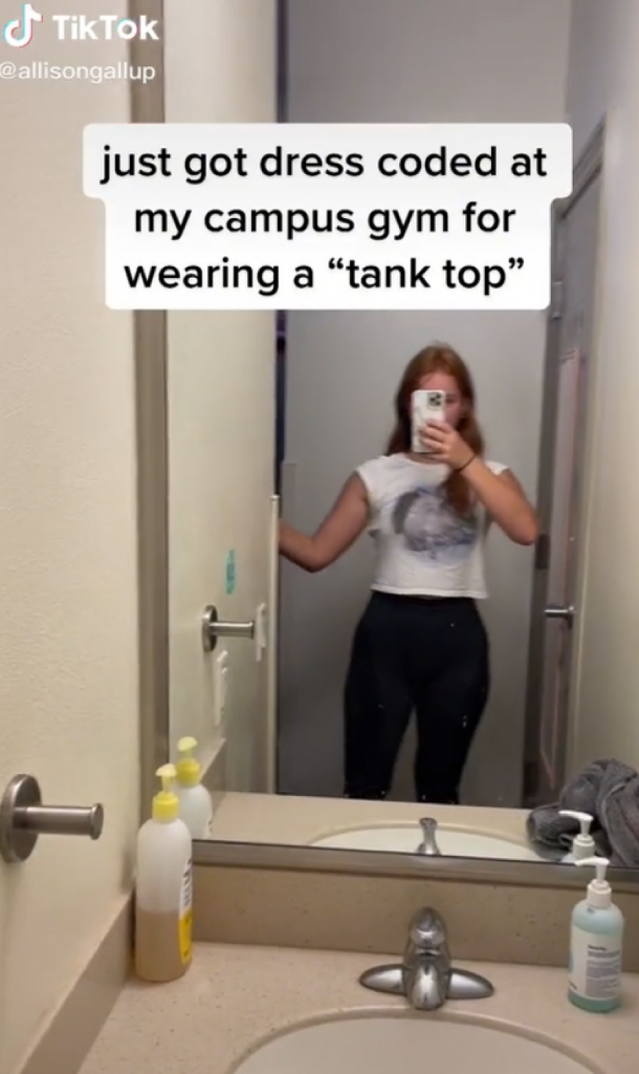 - Upravo sam u teretani u kampusu dobila pravila o nošenju majice bez rukava - rekla je dok je stajala ispred ogledala u toaletu, prenosi "Dejli star".