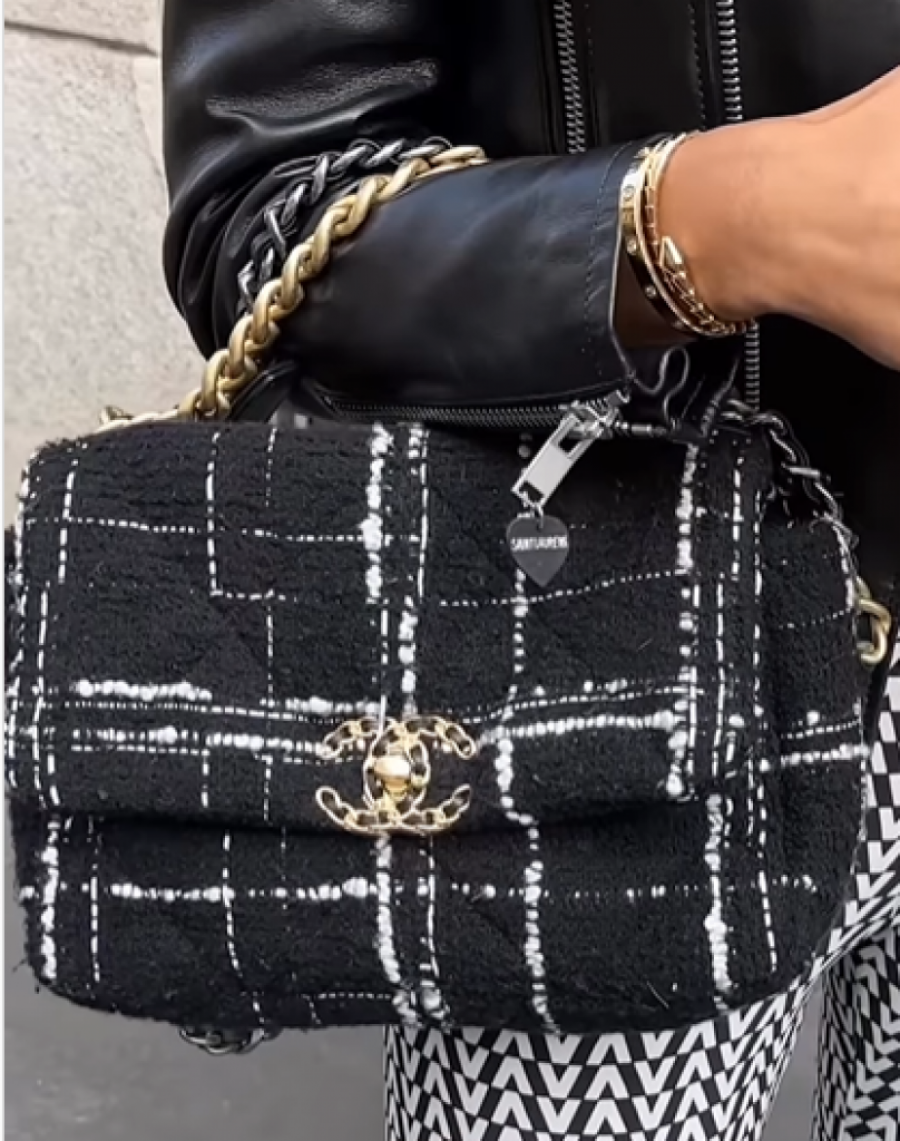 Ona ima crne Prada naočare od 43.796 dinara, Valentino majica u istoj nijansi sa belim slovima od 53.650 dinara, Saint Laurent kožna jakna od 739.057 dinara , onda crno bela Šanel torbica od 624.093 dinara koja ima zlatne detalje, uske Valentino pantalone od 97.446 dinara i Luj Viton čizme sa zlatnom šnalom LV od 181.753 dinara. Ali sve navedeno nije najskuplje na njoj, ima i nešto skuplje, a to je Kartier narukvica koja vredi 1.751.840 dinara. Pored toga, ponela je i Bvlgari narukvicu koja košta 651.465 dinara.
