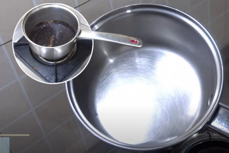 Na dnu je verovatno ostalo crno od fleka, ali sada uzmete kašiku i onda to sastružete. Sada bi već trebalo da je “otišlo“ oko 80 odsto masnoće, tako da ostatak samo operite deterdžentom za sudove i izribajte žicom, objašnjava kanal “Kabitina kuhinja“.
