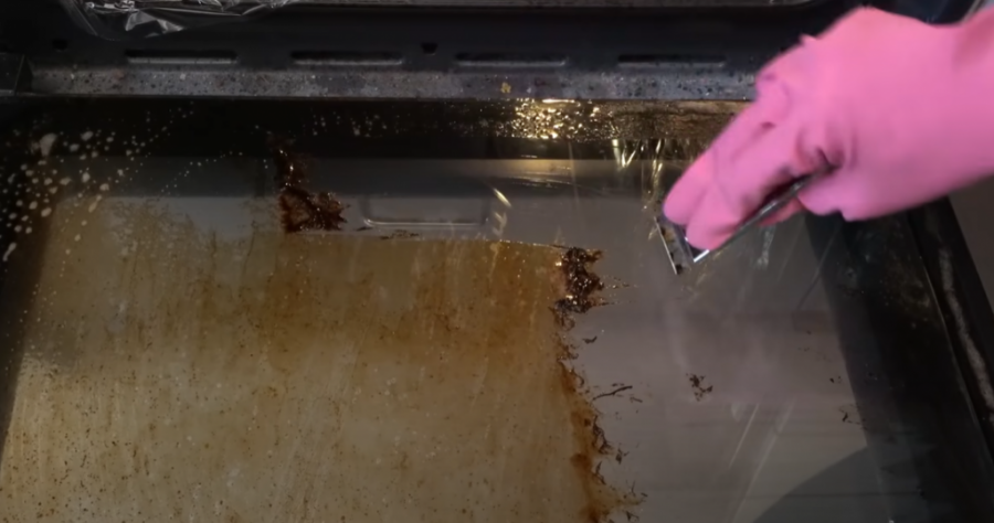 Čišćenje stakla od rerne, mnogo je lakše. Ponovite korak, isto poprskajte sredstvom za čišćenje ili odmašćivanje, zatim istrljajte sunđerom. Bilo bi odlično da imate metalnu pločicu za čišćenje stakla kojom ćete prevući preko masnoća i skinuti je. Na kraju pokupite sve što ste skinuli vlažnom krpom.