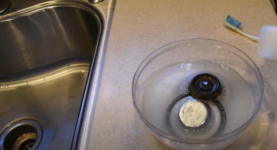 U jednu činiju sipajte oko četiri kašike sode bikarbone. Zatim sipajte sirće, malo po malo, dok ne napunite činiju. Izvadite delove koje sprečavaju protok hrane u odvod i stavite ih u činiju gde je soda bikarbona i sirće. Pored toga potrebna vam je četkica za zube i sunđer.