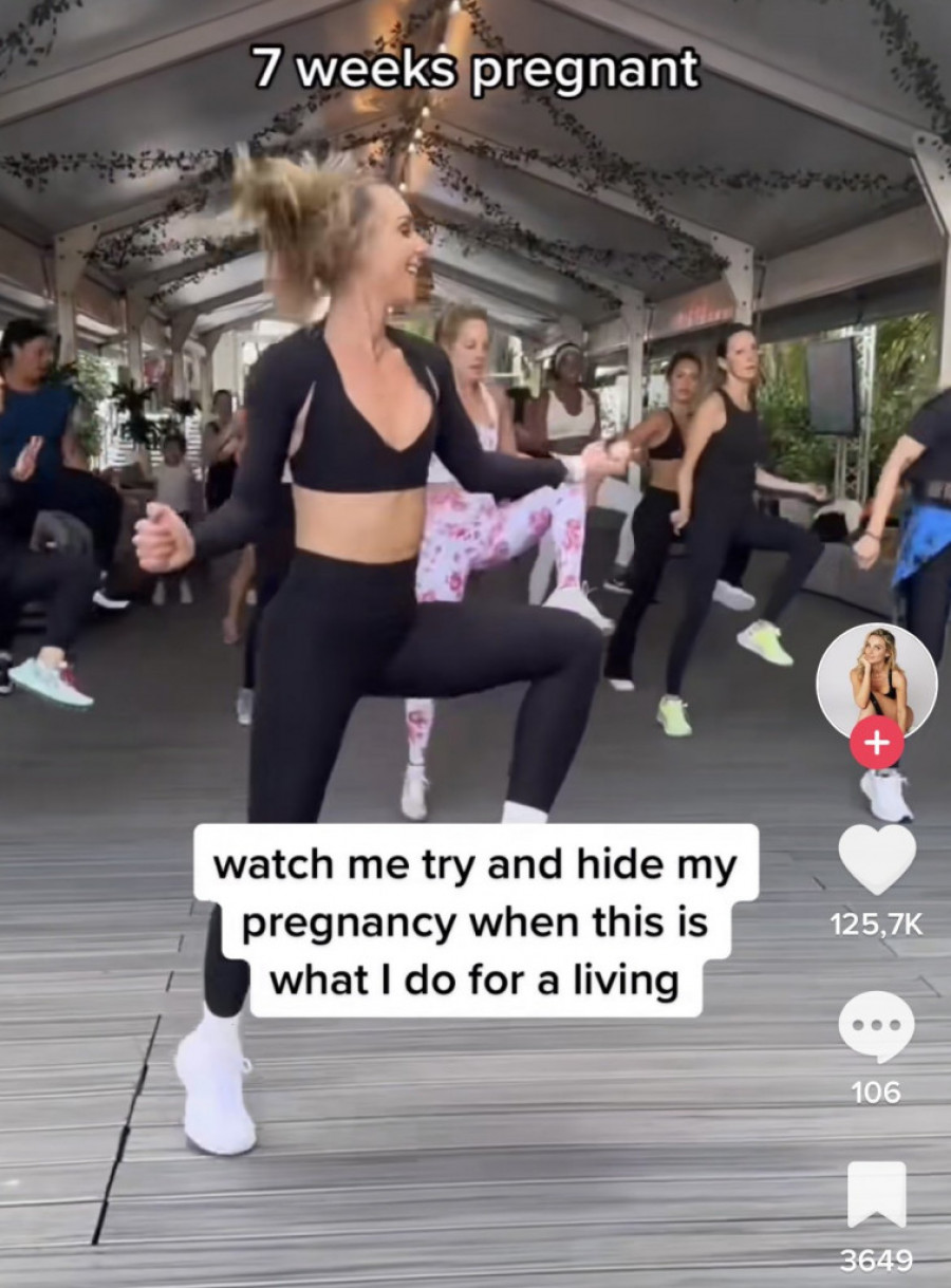 Ona je pokazivala stomak po nedeljama, čak je trenirala i u topovima i kratkim majicama, ali isti se nije ni nazirao. Sve do 16. nedelje trenirala je u sportskim topovima, a kada je stomak počeo da se vidi onda je obukla bodi. Posle 17. nedelje prešla je na široke majice. Zanimljivo je da se u 20. nedelji jasno videlo da nije reč o nadutosti ili nečemu sličnom, već da je trudna, ali ona je i dalje krila stomak. U 21. nedelji ženskoj grupi koju trenira zvanično je pokazala stomak i sve su bile oduševljene.