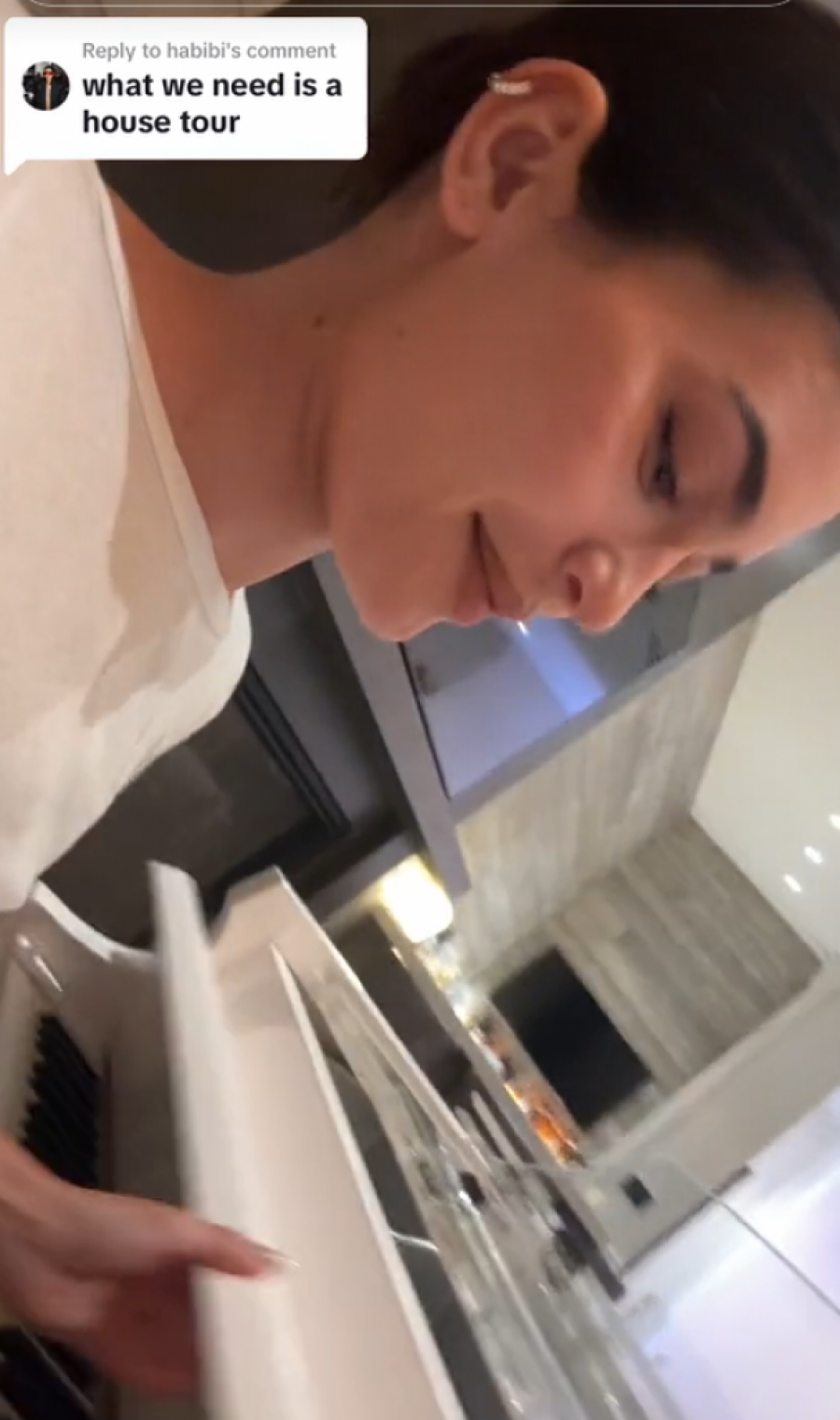 Takođe, pored bara dominira i prostrana dnevna soba koja je takođe opremljena u beloj boji. Kamin, TV i sto za bilijar takođe su deo dnevne sobe. Potom je pokazala i klavir i prokomentarisala da se nada da će njena ćerka naučiti da ga svira. Ipak, ono što je korisnicima ove društvene mreže zapalo za oko su grudi jer nije nosila brushalter. Osim što su fanovi primetili da se snima bez brushaltera, žalili su se jer ne vide skoro ništa pa su je žestoko iskritikovali.
