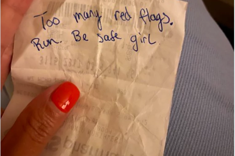Ona se zove Haida, a svoje iskustvo podelila je na Tviteru. Kaže kako joj je taj neznanac prišao dok je muškarac s kojim je bila na sastaku bio u toaletu i na brzaka joj je u ruku gurnuo papirić. U poruci je pisalo: "Previše crvenih zastavica. Beži. Budi sigurna, devojko".