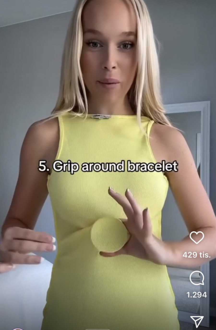 Devojka sa snimka na sebi ima haljinu koju želi da suzi. Potrebno je da haljinu skinete, okrenete je naopačke i obučete naopako. Provucite metalnu narukvicu i stavite je na sredinu stomaka. Obuhvatite rukom materijal oko narukvice i zavežite gumicom za kosu. Potom, haljinu pažljivo skinite i normalno je obucite. Primetićete na leđima jedan zanimljiv krug koji će učiniti haljinu još efektnijom za nošenje. Neće se ni primetiti da ste bilo šta uradile sa haljinom, a od viška materijala neće biti ni traga!