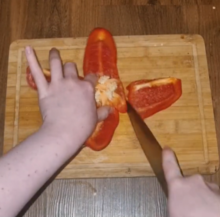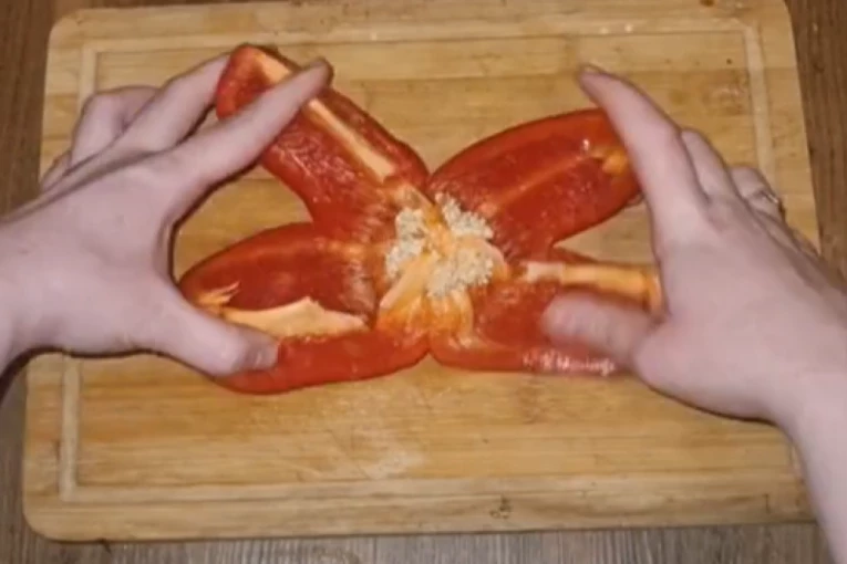 Jedna žena, podelila je na TikTok - u pametan trik kako da očistite paprike bez mnogo muke, a da semenke ne završe svuda po kuhinji. Potreban vam je samo nož. Papriku okrenite na deo gde je peteljka. Napravite rez i podelite je na četiri dela kao na fotografiji. Samo isecite krakove koji ste dobili i tako ćete se rešiti semenki u sredini.