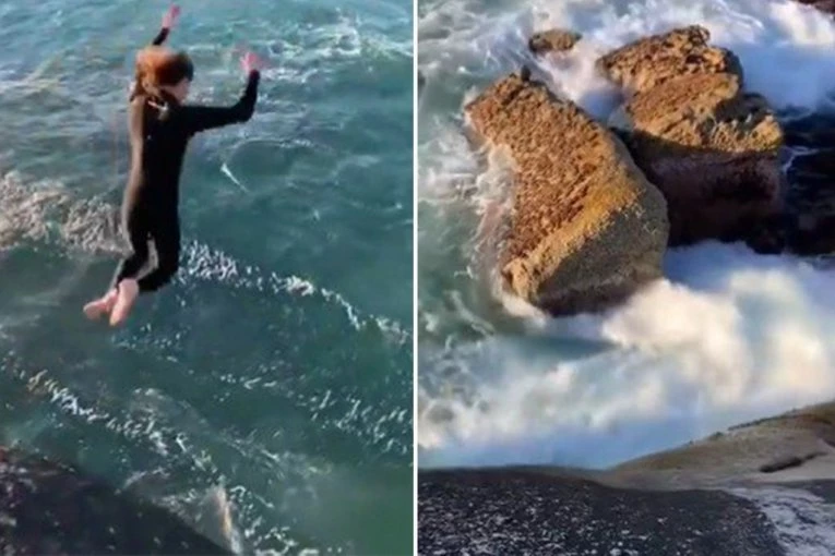 Ovaj veoma uznemirujući video je zabeležen na plaži Landudno u blizini Kejptauna, nakon što je nepoznati avanturista skočio sa litice visoke deset metara u more.