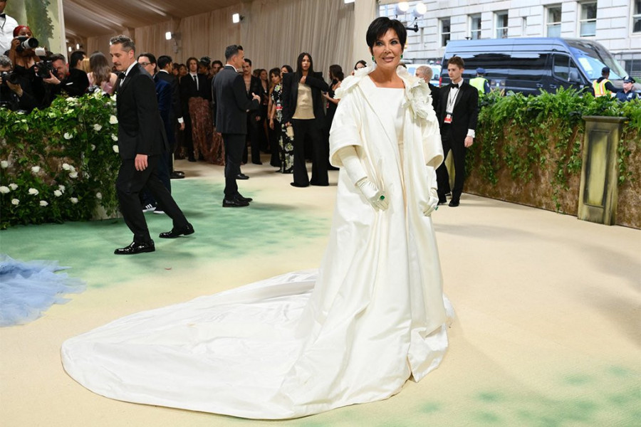 Kris Džener je nosila jednobojnu belu satensku haljinu i kaput koji je dizajnirao Oscar de la Renta. Zvezda "Kardašijanki" (68) počastila je ovogodišnju temu "Uspavane lepotice: Ponovno buđenje mode" izvezenim cvećem na vrhu haljine koje joj je išlo niz leđa. Džener (68) je zasijala na tepihu dok je hodala ruku pod ruku sa dečkom Korijem Gemblom (43) kao pratiocem. On je nosio potpuno belo odelo, ukrštenu ogrlicu, nekoliko prstenova i naočare za sunce.