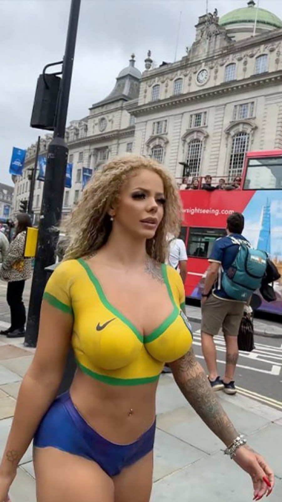 Tifani Santos, koja je takođe poznata kao influenserka sa impresivnih 233.000 pratilaca, odlučila je da na najneobičniji način pokaže svoju strast prema fudbalu i ponos na svoje brazilsko poreklo. Poreklom iz Sinopa u Brazilu, Tifani je provela četiri sata farbajući svoje telo u boje zastave svoje zemlje - sa malim plavim šortsom i žutim topom sa zelenim obrisima.